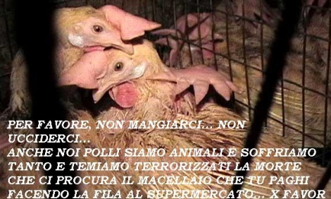 IL MINIMO CHE POSSIAMO FARE È CHIEDERE AL NOSTRO GOVERNO DI FAR CHIUDERE QUEI MACABRI LUOGHI DESTINATI A MACELLARE CHI ANCORA E' VIVO CHIAMATI (già solo il nome...) "MACELLI" e chiediamo di chiudere anche i lager dai quali provengono questi CONDANNATI A MORTE: GLI ALLEVAMENTI INTENSIVI. ANCHE I POLLI SONO ANIMALI. E SE SUCCEDESSE LO STESSO AI CANI COME REAGIRESTE? COS'E', SE ACCADE AI POLLI TUTTO VA BENE E CI RIDIAMO PURE SU?
