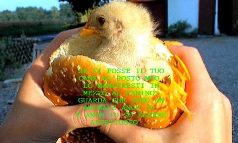 QUANDO DICO CHE PIU' GLI ANIMALI SONO PICCOLI, PIU' DOBBIAMO LIBERARLI IN FRETTA DAI MACELLI, ...INTENDO DIRE ANCHE QUESTO. LE ANGHERIE CHE SUBISCONO I PULCINI NEL TRITACARNE O I POLLI MACELLATI VIVI, NE' X I MAIALI, NE' X I VITELLI ACCADONO.