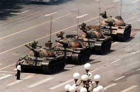 Nel mio personalissimo calendario laico (di santa basto io), queste sono le settimane in cui ricorrono le megaustioni in spiaggia, il terremoto e la protesta di Piazza Tienanmen. Perché? Nel primo caso perchè le raccomandazioni sulle prime esposizioni al sole mi vengono in mente solo quando è troppo tardi. Ma quest’anno, come dire, non ce n’è: c’ho ancora su il golfino. E se non è un filtro solare quello ditemi voi cosa lo sia. Nel secondo caso perchè esattamente un anno fa ho conosciuto una nuova paura: quella del terremoto, dell’evento imprevisto in grado di scompigliare qualsiasi progetto di vita. Che noi al su e giù dell’acqua c’eravamo abituati, ma al traballare della terra proprio no. E forse per questo il ricordo è ancora talmente vivo che ancora adesso alle vibrazioni di un camion appena un po’ più grosso del normale ci guardiamo negli occhi con le pupille a palla. Ho visto che anche l’Enel ricorda che è trascorso circa un anno dall’evento, e infatti molto carinamente ci ha mandato gli auguri; certo, Lei li chiama auguri e noi invece bollette, ma sono solo punti di vista diversi. E poi fine maggio-inizio giugno per me vuol dire Piazza Tienanmen. Sempre. Perché quella foto (questa foto) m’ha colpito dalla prima volta che l’ho vista, per la sua forza, per la sua assurdità. Perché in piazza ci fai il mercato, le feste di paese, ci acclami il nuovo sindaco che offre la porchetta a tutti. Non t’immagini un carrarmato. Figurarsi più di uno. Ed è altrettanto assurdo il ragazzo che si piazza davanti a questo popò di spiegamento: magrolino, con gli abiti che sembrano dismessi dal cugino più grande e una borsa che t’immagini possa contenere al massimo una focaccia con le cicciole per il pranzo, giusto per non arrivare a sera a stomaco vuoto. Certo niente di pericoloso, sicuramente niente di rivoluzionario. E invece tiè. Questi 50 chili d’uomo ti diventano un simbolo: di lotta, di volontà, di incoscienza anche, se vogliamo. E per un momento riesce anche a far credere al mondo che l’impossibile non solo diventi possibile, ma che stia accadendo, lì, in quel preciso istante. Purtroppo sappiamo tutti com’è finita. Ma a dirla tutta, quando guardo la foto, non è a lui che penso. In realtà penso all’autista del carrarmato. Per lui nessuna gloria imperitura nei secoli, niente di niente. Eppure il suo gesto è altrettanto significativo di quello del ragazzo. Voglio dire, avrebbe potuto stamparlo a terra come un cartone animato. Anzi, avrebbe dovuto farlo. Per gli ordini ricevuti, per evitare punizioni inimmaginabili, perché probabilmente gli avrebbero dato una medaglia e una bottiglia di maotai. E invece no, lui sceglie di fermarsi. E la mia simpatia va a lui, perché apprezzo sempre chi non dimentica mai di essere prima un essere umano, e solo dopo ragioniere, boia o segaiolo. Avercene di persone così. Ma adesso vado, prima che mi prendano fuoco le lasagne. Perché dal vedere un filino di fumo uscire dal forno al far diventare questi i giorni in cui i pompieri hanno fatto irruzione a casa mia è davvero un attimo. Ciao guys.