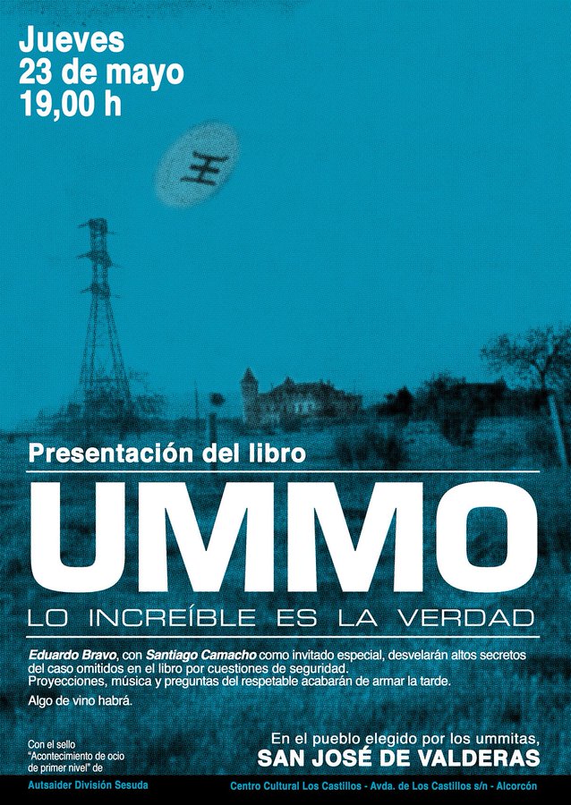 EduardoBravo · 23h Vediamo, quelli del terzo turno di #ViajesNaveDelMisterio, che non so se avete sentito: giovedì 23 maggio alle 19:00. a San José de Valderas, presentazione di "Ummo. L'incredibile è la verità »con @ SantiCamach0 E con questo Ummo continua e sul web si espande la presenza di questa realta' estranea, ma gia' presente nel nostro mondo. gli Et di Ummo presenti in Terra! UMMO.L''INCREDIBILE E' LA VERITA'