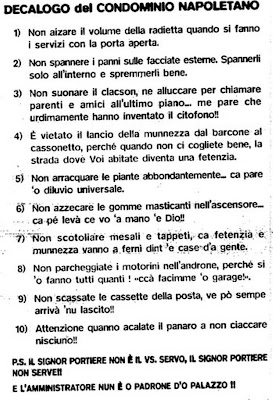 A MALEDUCATIIIIIIIIIIII!!!!!!! 'TACCI VOSTRA! SETE PARTITI TUTTI, CHI M'HA LASCIATO IL CANE DA PORTA' FORI, ...E MANCO 'NA CARTOLINA E' ARRIVATA... BRAVI BRAVI! PS per quellascorbutica... è arrivata la bolletta del gas 36 euro, ho provveduto al pagamento perchè scade domani... e visto che ho anticipato il dinero, mi aspetto degna e lauta ricompensa PS per kuellainportineria... è arrivata una convocazione da parte del Comitato del Festival di Sanremo... e non credo sia per un posto da macchinista PS per quellokestendemale... Ho ritirato i panni, ma ce stavano cacate de piccione (e de artri animali che 'nze ponno dì!) su mutande e bretelle (????). Gli ho dato n'artra ripassata, ma con la lavatrice mia che la centrifuga ce l'ha! A questo punto siete pregati di portare le Vostre Egregie CHIAPPE a casa che so rimasta sola nel palazzo co la gattara...e in più ci sono strani rumori che vengono dal seminterrato... credo sia colpa di quelladisotto