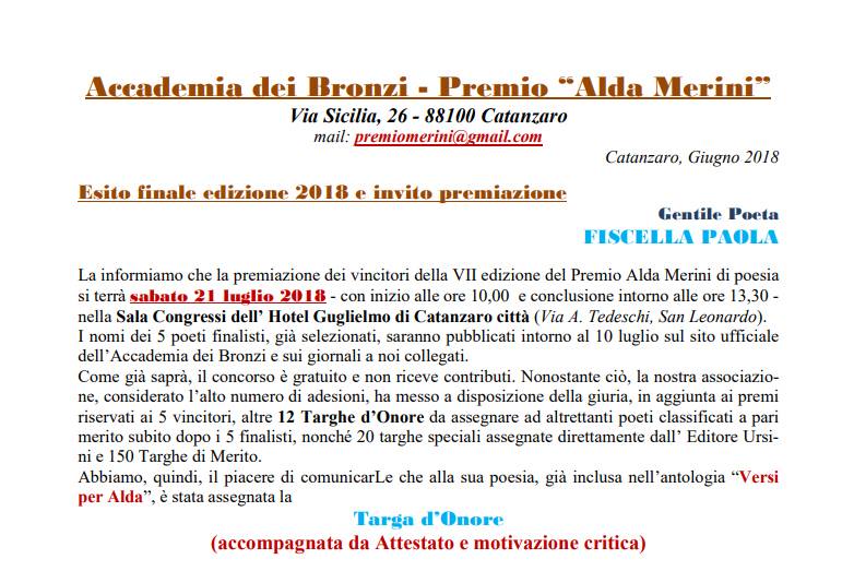 Immensa soddisfazione essere tra le 12 Targhe d'Onore. "Premio Alda Merini 2018", grazie al Presidente Vincenzo Ursini e a tutta l'Accademia Dei Bronzi; Il "Quotidiano del Sud", articolo pubblicato il 15 Luglio 2018