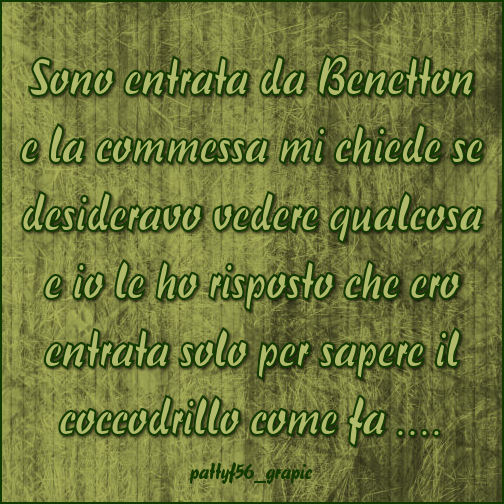 il che vuol dire che nn sono commerciabili, nn si possono modificare, nn si può cambiare il nome del file e nn si può togliere la mia firma. Grazie Le immagini pubblicate in questo blog si possono prelevare ma sono di mia proprietà e di proprietà delle persone che mi permettono di pubblicarle. Si chiede solo il rispetto del lavoro altrui nn manipolando le immagini stesse enn cambiandone il nome. Per le immagini che faccio uso, oltre al materiale fatto da me, materiale di grafica reperito nei gruppi grafici e immagini jpg reperite nel web con semplici ricerche su ggogle. Sarebbe gradito un commento se viene prelevato qualcosa. Grazie Pattyf56 DISCLAIMER : Questo blog nn rappresenta una testata giornalistica in quanto viene aggiornato senza alcuna periodicità. Nn può pertanto considerarsi un prodotto editoriale ai sensi della L. n. 6 del 07.03.2001. L'autrice dichiara di nn essere responsabile per i commenti inseriti nei post. Eventuali commenti dei lettori, lesivi dell'immagine e dell'onorabilità di persone terze nn sono da attribuirsi all'autrice, nemmeno se il commento viene espresso in forma aninima o criptata. Immagini, contenuti e marchi citati in questo blog sono copyright dei rispettivi proprietari. Grazie