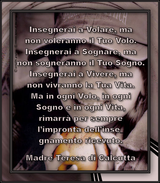 ![]() ![]() Un Anziana Signora si siede in Un caffè. La cameriera porta il menu al tavolo e chiede l’ordine. La vecchia signora risponde: "Quanto costa un pezzo di torta?" La cameriera risponde: "3 euro" La donna anziana prende alcune monete dalla tasca, inizia a contare lentamente e poi chiede di nuovo: " e quanto costa quella più piccolina?" La cameriera si innervosisce un po’, dato che aveva molti tavoli da servire e le rispose: "2 euro" "Va bene, allora prendo volentieri quella più piccola", rispose la vecchia signora. La cameriera portò scocciata la torta e mise subito il conto sul tavolo pensando tra se, "che tirchia, che vada via subito" La vecchia signora, mangiando molto lentamente e con piacere la torta, si alzò lentamente, mise i soldi sul tavolo e se ne andò. Quando la cameriera andò per pulire il tavolo, si accorse che la vecchia signora le aveva lasciato 1 euro di mancia. L’emozione e la sorpresa le fecero scendere una lacrima. Si voltò velocemente alla ricerca dell’anziana donna per ringraziarla. Era troppo tardi, se ne era andata e non era più visibile al suo sguardo. Lei si sentì in colpa per aver giudicato tirchia quella vecchietta. La vecchietta aveva solo 3 euro e si era limitata a prendere una fettina di torta da 2 euro per lasciarle una mancia. MORALE: Questa storia commovente dimostra chiaramente che non si possono trarre conclusioni affrettate. Perché prima di giudicare qualcuno si dovrebbe guardare dentro alle sue mura, conoscere le sue paure e le preoccupazioni. Allora vedrai quanto sia fragile l’uomo dietro la maschera dell’apparenza. (dal web - immagine trovata nel web - la cornice una mia creazione)