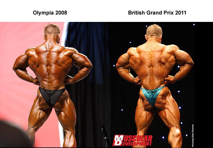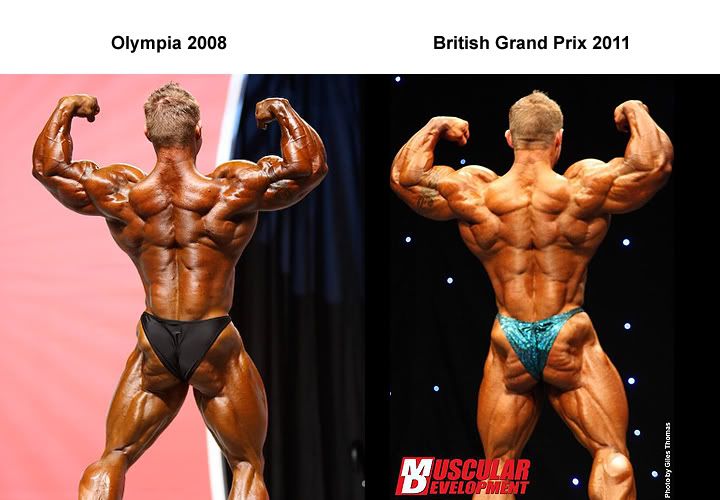 In alcuni forum americani, dedicati al bodybuilding, ho trovato due foto che mettono a confronto il fisico di Lewis all'Olympia 2008 con quello del G.P. Britannico 2011. La cosa che possiamo notare è il miglioramento dello sviluppo della schiena. Questo muscolo era sicuramente uno dei punti deboli di questo campione, ma come possiamo vedere dalla foto... ora è diventato uno dei suoi punti di forza.